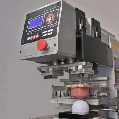 Transferring ink from a printing plate onto a silicone pad, which then stamps the image onto the surface of the object.